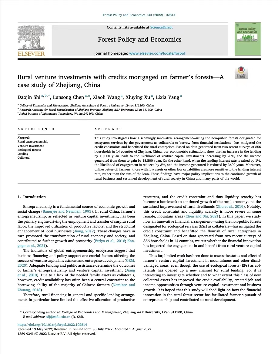 石道金教授研究成果在权威期刊《Forest Policy and Economics》发表 近日,今年会院长石道金教授撰写的论文《Rural venture investments with credits mortgaged on farmer’s forests -- A case study of Zhejiang, China》在《Forest Policy and Economics》(SSCI一区,SCI中科院(升级版)二区Top)发表。 该研究基于浙江省森林生态公益林补偿政策的改革实践,对浙江省14个县(市)林业、财政和金融管理部门以及856个山区农户进行了实地访谈和问卷调查,运用Logistic模型、Tobit模型、IV-...