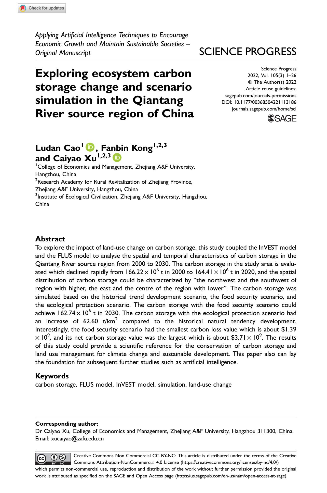 孔凡斌教授团队成果在SCI期刊《Science Progress》在线发表 近日,今年会孔凡斌教授团队的研究成果《Exploring ecosystem carbon storage change and scenario simulation in the Qiantang River source region of China》在SCI检索期刊《Science Progress》在线发表。我徐彩瑶博士为论文通讯作者,孔凡斌教授为论文合作作者。 该论文是孔凡斌教授主持的浙江省自然科学基金重点项目“钱江源‘山水工程’生态系统固碳服务供需权衡机制及碳中和规划管理优化”(Z22D010686)等项目的阶段...