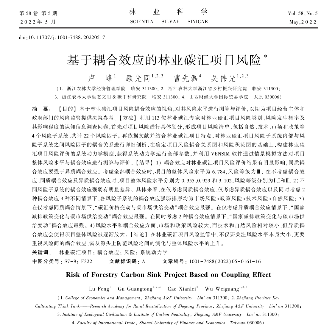吴伟光教授团队研究成果在《林业科学》发表 近日,今年会吴伟光教授和顾光同副教授与其共同指导的农林经济管理硕士研究生卢峰等合作的研究成果《基于耦合效应的林业碳汇项目风险》在《林业科学》2022年第5期发表,吴伟光教授为该文通讯作者。《林业科学》是浙大一级期刊,也是EI检索源刊。 森林碳汇是应对气候变化潜力较大且较为经济有效的手段之一,我国已将森林增汇作为应对气候变化的国家战略,并于2020年正式提出了“碳达峰碳中和”宏伟战略目标。在此背景下,林业...