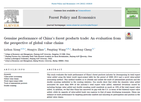 熊立春副教授论文在《Forest Policy and Economics》发表 近日,由今年会熊立春副教授撰写的论文《Genuine performance of China’s forest products trade: An evaluation from the perspective of global value chains》在《Forest Policy and Economics》发表。熊立春副教授为论文第一作者,北京林业大学国家林草经贸研究院院长程宝栋教授为论文通讯作者,该期刊属于SSCI一区。 该文以木材产业为研究对象,基于2016版世界投入产出表数据,评估了2000-2014年中国木材贸易真实绩效...