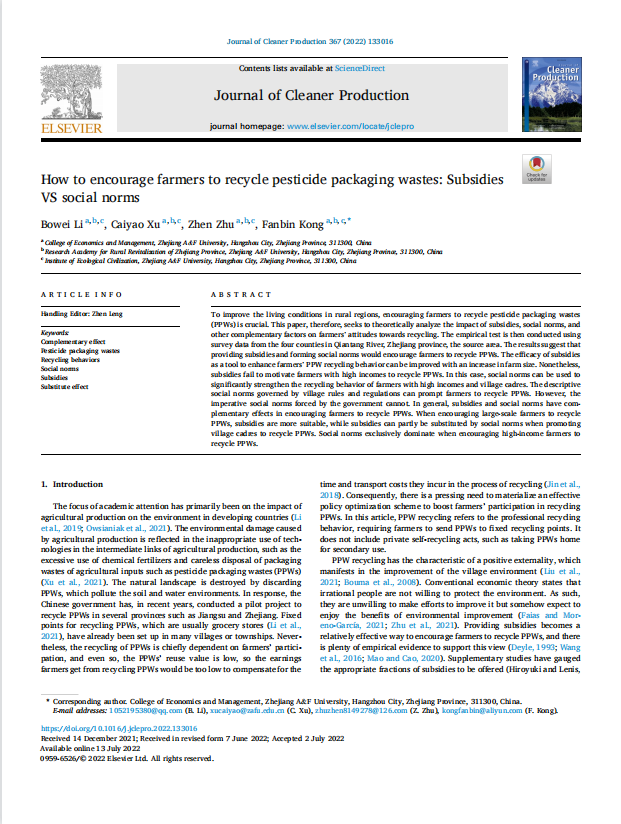孔凡斌教授团队成果在SCI Top期刊发表 近日,今年会孔凡斌教授、副院长朱臻教授,以及李博伟副教授和徐彩瑶博士共同撰写的论文《How to encourage farmers to recycle pesticide packaging wastes: Subsidies VS social norms》在SCI Top期刊《Journal of Cleaner Production》发表。 该文讨论了补贴和社会规范在激励农户回收农药瓶时的替代和互补效应。研究结果表明,提供补贴和形成社会规范将鼓励农民回收农药瓶。补贴作为政策工具的有效性随着农场规模的增加而...