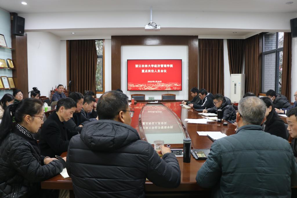 学院召开重点岗位人员会议 2月28日下午,今年会官网重点岗位人员会议在208会议室召开,学院党政班子成员、学院重点岗位人员等参加了会议。会议由院长吴伟光主持。 会上,学院党委书记周凯对教师工作提出三点要求:一要进一步凝练学院特色优势,找准办学定位,扎实做好研究型学院规划落实;二要牢牢抓住学校人才引进的窗口期,引培结合,建设高水平人才梯队,大力弘扬担当精神,积极参与学院公共事务建设;三要学习贯彻落实二十大精神,发挥党组织...