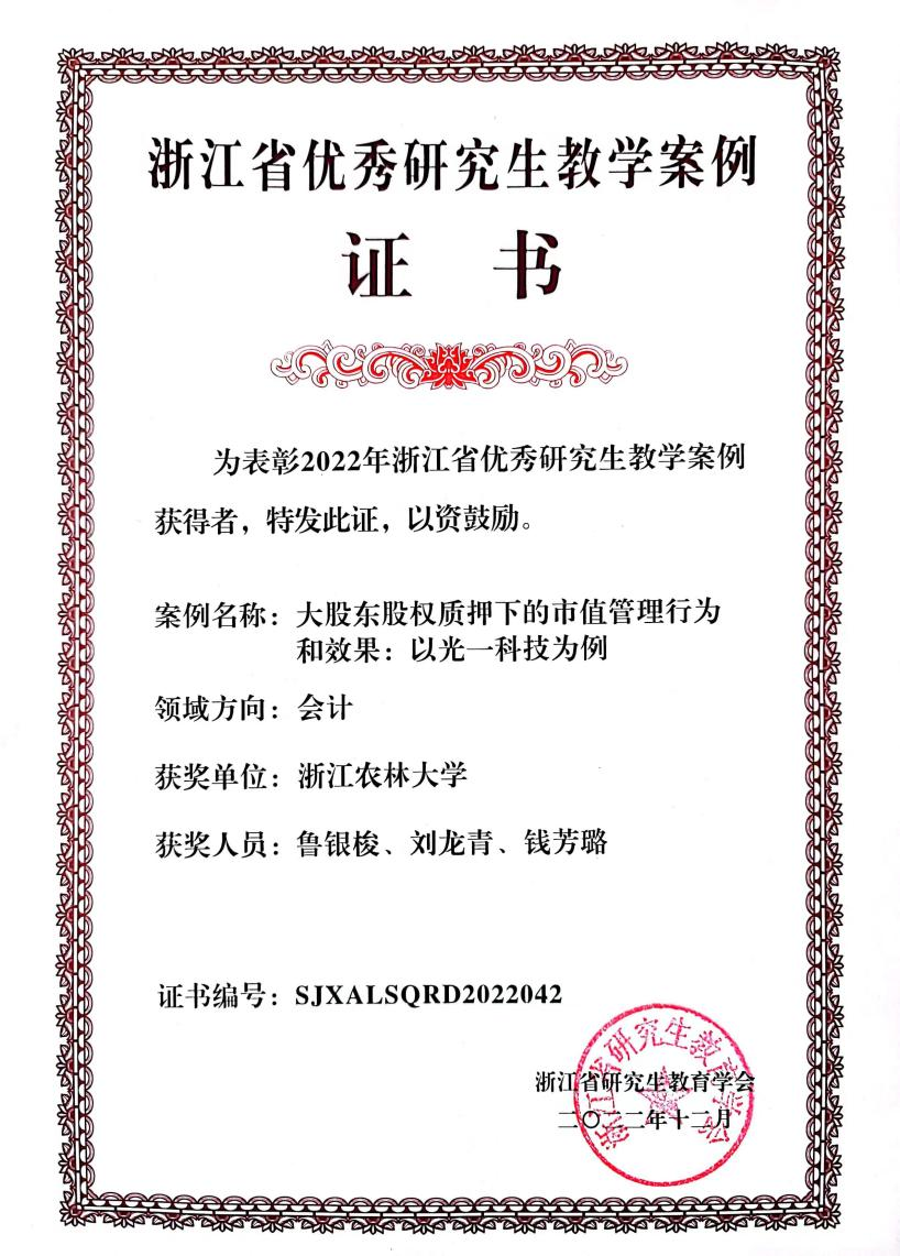 日前,浙江省研究生教育学会组织开展了2022年全省优秀研究生优秀教学案例认定工作,并于近日公布了“2022年浙江省优秀研究生教学案例”最终认定名单,今年会jinnianhuicom共有5篇案例入选,其中“刘龙青名师工作室”成员鲁银梭和负责人刘龙青两位老师合作撰写的案例《大股东股权质押下的市值管理行为和效果:以光一科技为例》入选。工作室不定期开展教学研讨工作,鼓励师生理论联系实际,深入企业开展原创案例研究。