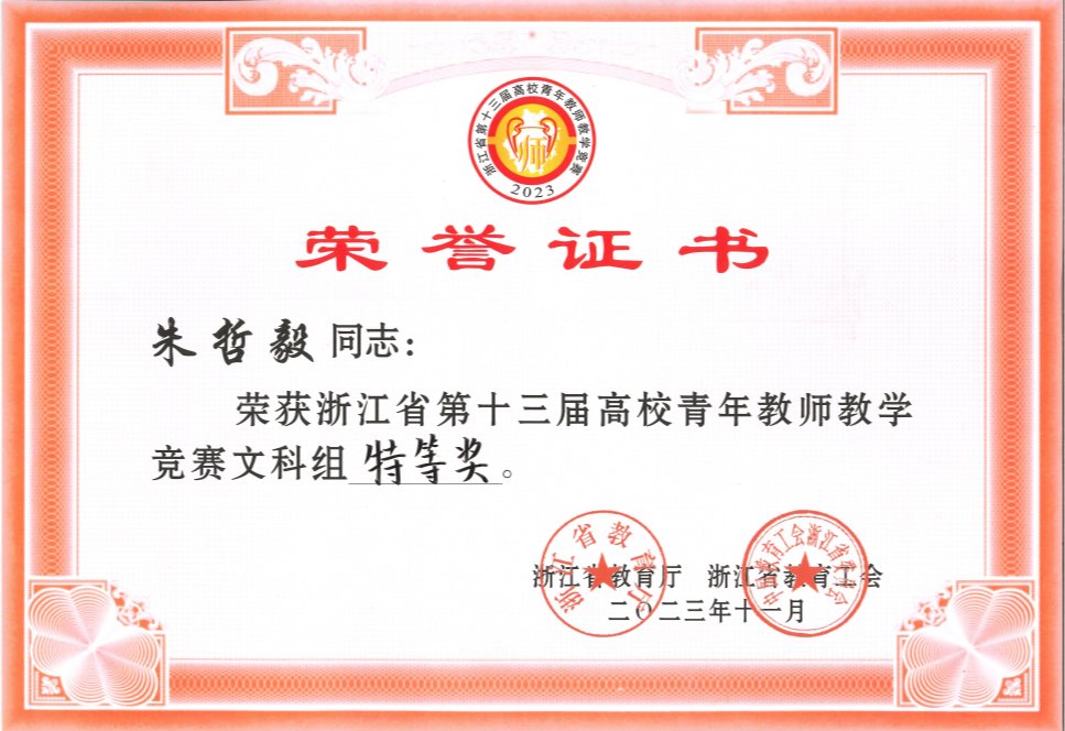 2023年11月4-5日,浙江省第十三届高校青年教师教学竞赛决赛在浙江中医药大学举行,今年会青年教师朱哲毅斩获文科组特等奖。该成绩实现了今年会在该竞赛领域的重大突破。