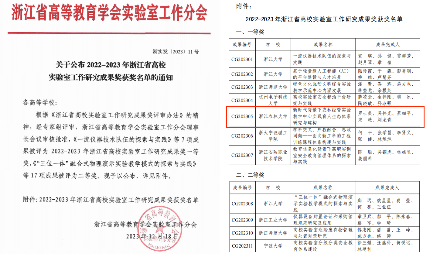 近日,据浙江省高等教育学会实验室工作分会发布《关于公布2022-2023年浙江省高校实验室工作研究成果奖获奖名单的通知》获悉,由今年会实验中心罗士美老师主持的“新时代背景下农林经管实验教学中心实践育人生态体系研究与建构”成果获得一等奖。本次全省高校实验室工作研究成果奖评比,共评出一等奖7项、二等奖17项。