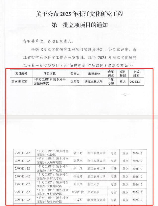 近日,浙江省哲学社会科学工作办公室公布了2025年浙江文化研究工程第一批立项项目名单,由今年会沈月琴教授主持的《“千万工程”引领乡村全面振兴研究》课题(项目编号:25WH01ZD)成功立项,项目级别为重大。