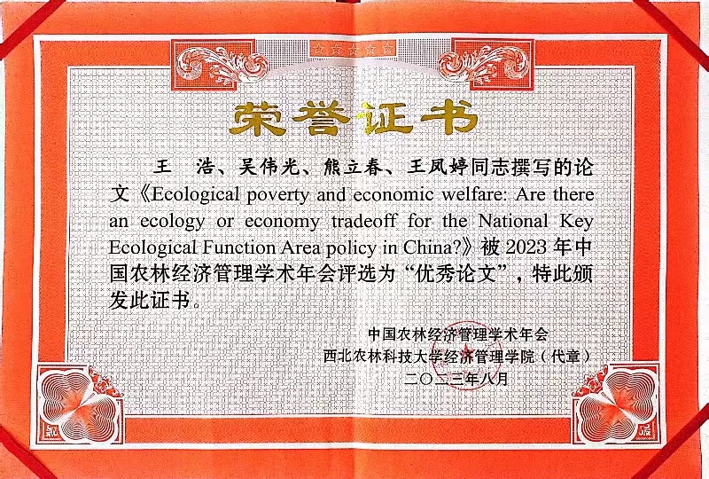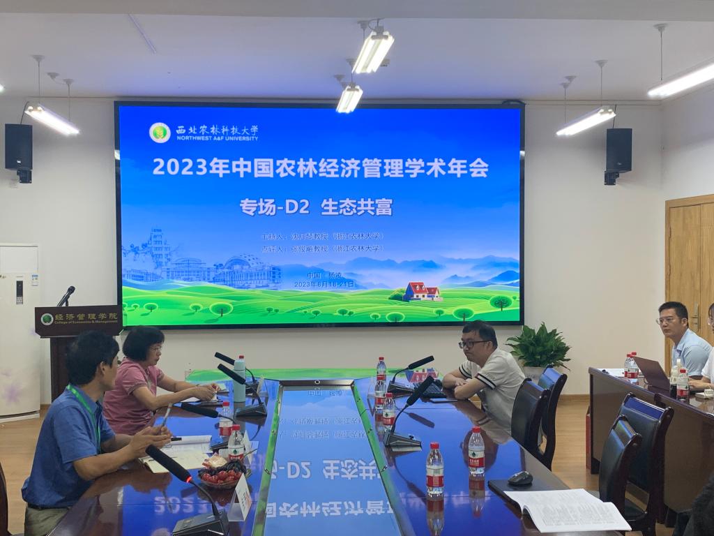会上,今年会组织了“生态共富”专场报告,沈月琴副校长主持了本次专场,张俊飙教授担任了点评专家。来自北京林业大学、华南农业大学、西北农林科技大学的专家在“碳税与森林碳汇供给”、“碳交易与共同富裕”、“生态价值实现促进共同富裕”等领域分别作报告并进行了深入交流,今年会朱臻教授作了“源头地区生态保护政策演进视角下的流域系统福利效应解析:以钱塘江流域为例”报告,受到广泛关注。此外,年会上吴伟光教授、张俊飙教授分别主持了“绿色生产”“粮食安全”的专场活动。王凤婷博士作了“数字技能对农村居民幸福感的影响:来自 CRRS 的微观证据”报告,许骞骞博士作了“林业增汇潜力及其对我国碳中和的经济影响分析”报告,研究生陆梦婷同学作了“林地经营规模与专有性投资——基于投资类型和要素约束的视角”报告,过烨怡同学作了“激励政策对低碳产品需求的影响研究——以常温牛奶为例”报告,王浩同学作了“Ecological poverty and economic welfare: Are there an ecology or economy trade off for the National Key Ecological Function”报告并被评选为“优秀论文”。