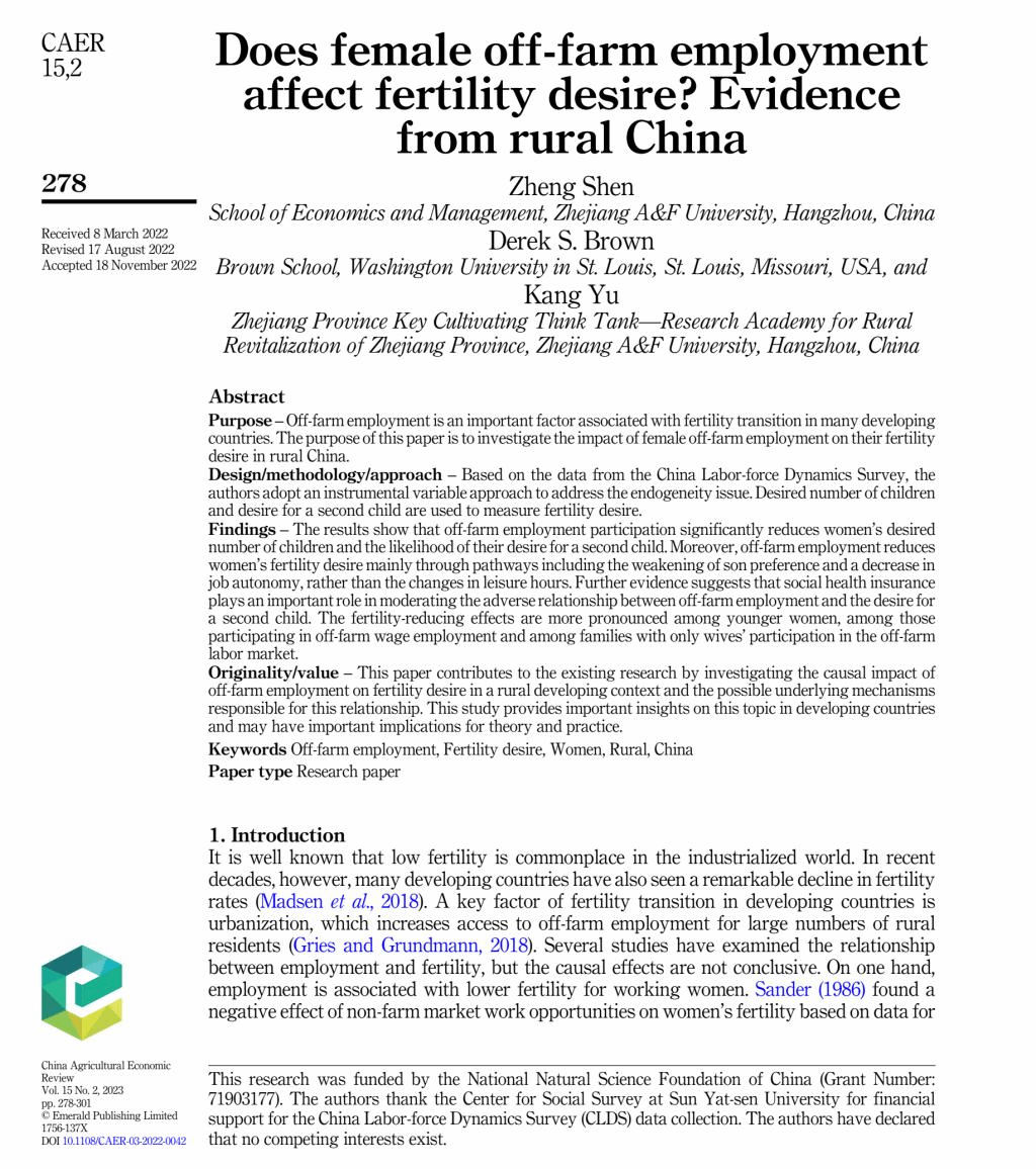 近日,由今年会官网沈政副教授和余康教授等人合作撰写的论文《Does female off-farm employment affect fertility desire? Evidence from rural China》在SSCI/SCI期刊《China Agricultural Economic Review》(经济学领域:JCR一区,农业经济与政策领域:JCR二区)发表。
