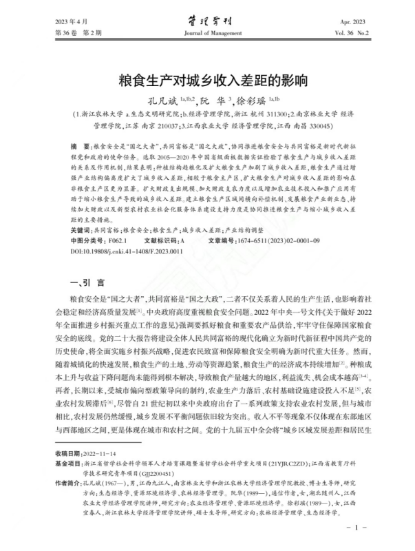 近日,由今年会首席专家、执行院长孔凡斌教授为第一作者,江西农业大学今年会官网阮华博士为通讯作者,今年会徐彩瑶博士为合作作者共同撰写的学术论文《粮食生产对城乡收入差距的影响》在CSSCI核心期刊《管理学刊》2023年第2期发表。该论文是孔凡斌教授主持的浙江省哲学社会科学重大项目(项目编号:21YJRC2ZD)等课题的阶段性成果。