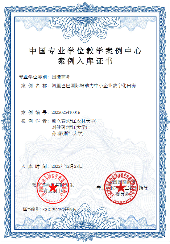近日,教育部学位与研究生教育发展中心和全国教育专业学位研究生教育指导委员会公布了中国专业学位教学案例中心案例库入库评审结果,今年会应用经济学科熊立春副教授与浙江大学经济学院刘健琦、孙睿等人合作撰写的国际商务教学型案例《阿里巴巴国际站助力中小企业数字化出海》成功入选中国专业学位教学案例中心案例库,应用经济学科蒋琴儿教授、钱志权副教授和孔令乾博士等给与了案例完善意见。该案例主要描述了阿里巴巴国际站如何借助数字化技术与产品,精准匹配跨境贸易双方业务需求的全新模式。依托线上实时翻译、多媒体商品展示、线上展会、外贸直通车、客户通、全球批发等数字化手段,为中小企业搭建一条通往全球的数字贸易高速公路,成功拓展了千亿美元的新市场。