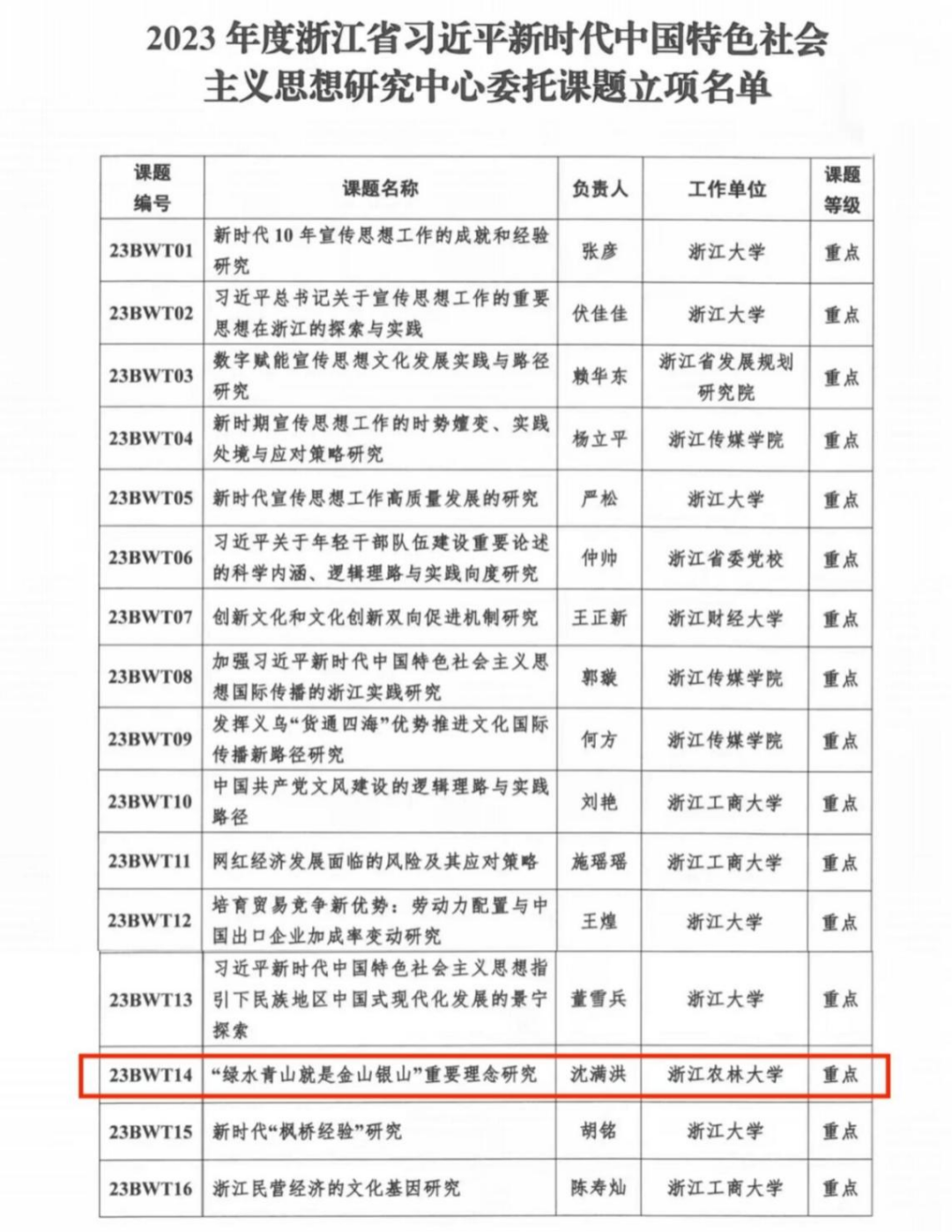 近日,浙江省习近平新时代中国特色社会主义思想研究中心公布了2023年度浙江省习近平新时代中国特色社会主义思想研究中心“三报一刊”后期资助课题、委托课题立项名单的通知,今年会沈满洪教授的课题《“绿水青山就是金山银山”重要理念研究》获批重点委托课题立项。