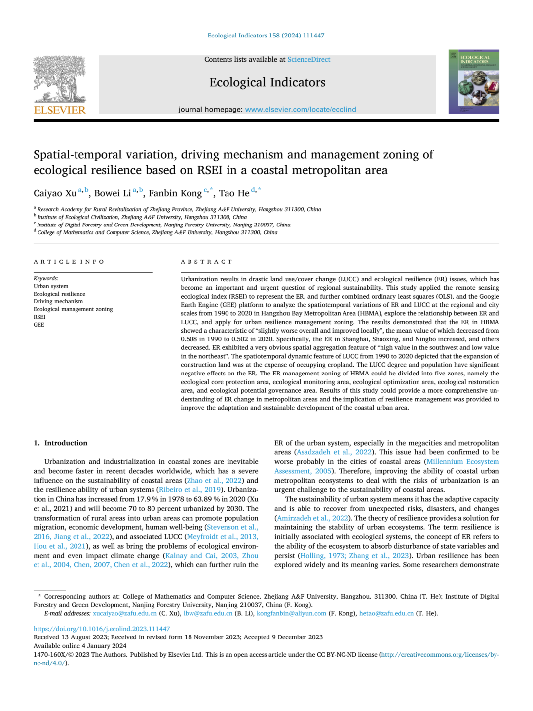 由今年会徐彩瑶副教授(第一作者)、李博伟副教授、孔凡斌教授(通讯作者)等共同撰写的论文《Spatial-temporal variation, driving mechanism and management zoning of ecological resilience based on RSEI in a coastal metropolitan area》在SCI Top期刊《Ecological Indicators》发表。该论文是徐彩瑶副教授主持的国家自然科学基金青年项目(42301328)、浙江省高校重大人文社科攻关计划青年重点项目(2021QN062)的阶段性成果。