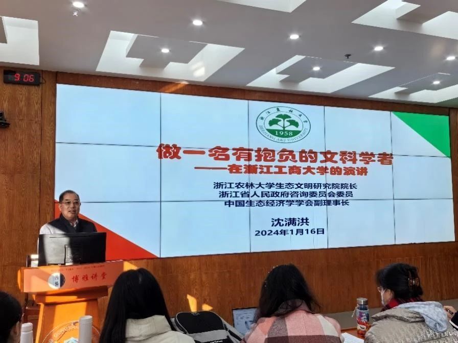 学院沈满洪教授继2023年为浙江大学、宁波大学、浙江工商大学、浙江理工大学、嘉兴大学、中共浙江省委党校做高校文科发展、国家社科基金申报、大学智库建设等方面的辅导报告后,新年伊始,分别于1月12日为浙江师范大学经济与管理学院老师做了题为《申报国家社科基金项目的心得体会》的报告、1月16日为浙江工商大学“社科学术能力提升班”老师做了题为《做一名有抱负的文科学者》的报告。