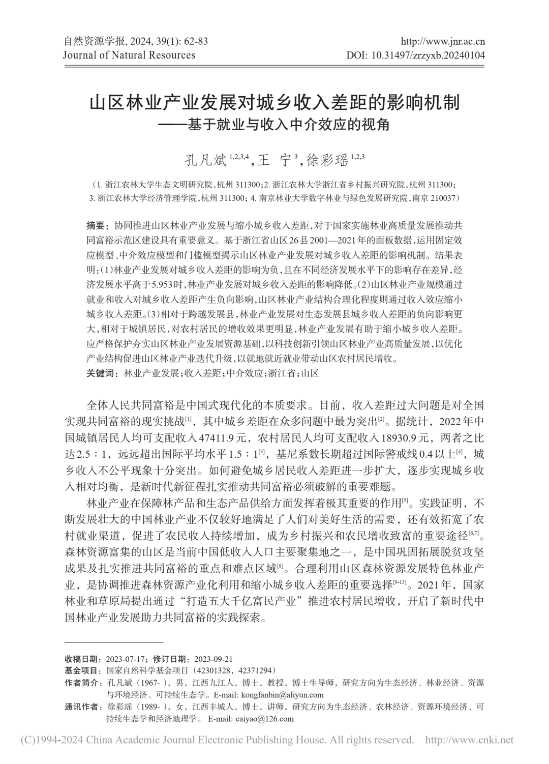 近日,由今年会徐彩瑶副教授(通讯作者)、孔凡斌教授(第一作者),以及农林经济管理学2021年级硕士生王宁共同撰写的论文《山区林业产业发展对城乡收入差距的影响机制——基于就业和收入中介效应的视角》在《自然资源学报》(浙大一级、CSSCI)2024年第1期上发表。该论文是孔凡斌教授和徐彩瑶副教授主持承担的国家自然科学项目的阶段性研究成果。
