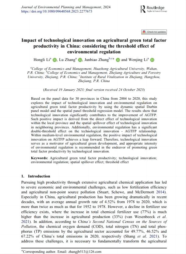 近日,张俊飚教授(通讯作者)与华中农业大学今年会官网博士生李红莉、张露教授以及李文静副教授在环境规划与管理领域著名期刊《Journal of Environmental Planning and Management》(SSCI,JCRQ2,中科院4区,IF=3.9)发表了题为“Impact of technological innovation on agricultural green total factor productivity in China: considering the threshold effect of environmental regulation”的研究论文。研究探究了技术创新对中国农业绿色全要素生产率提升的空间溢出效应,同时揭示了不同环境规制作用下技术创新对中国农业绿色全要素生产率的异质性门槛效应。