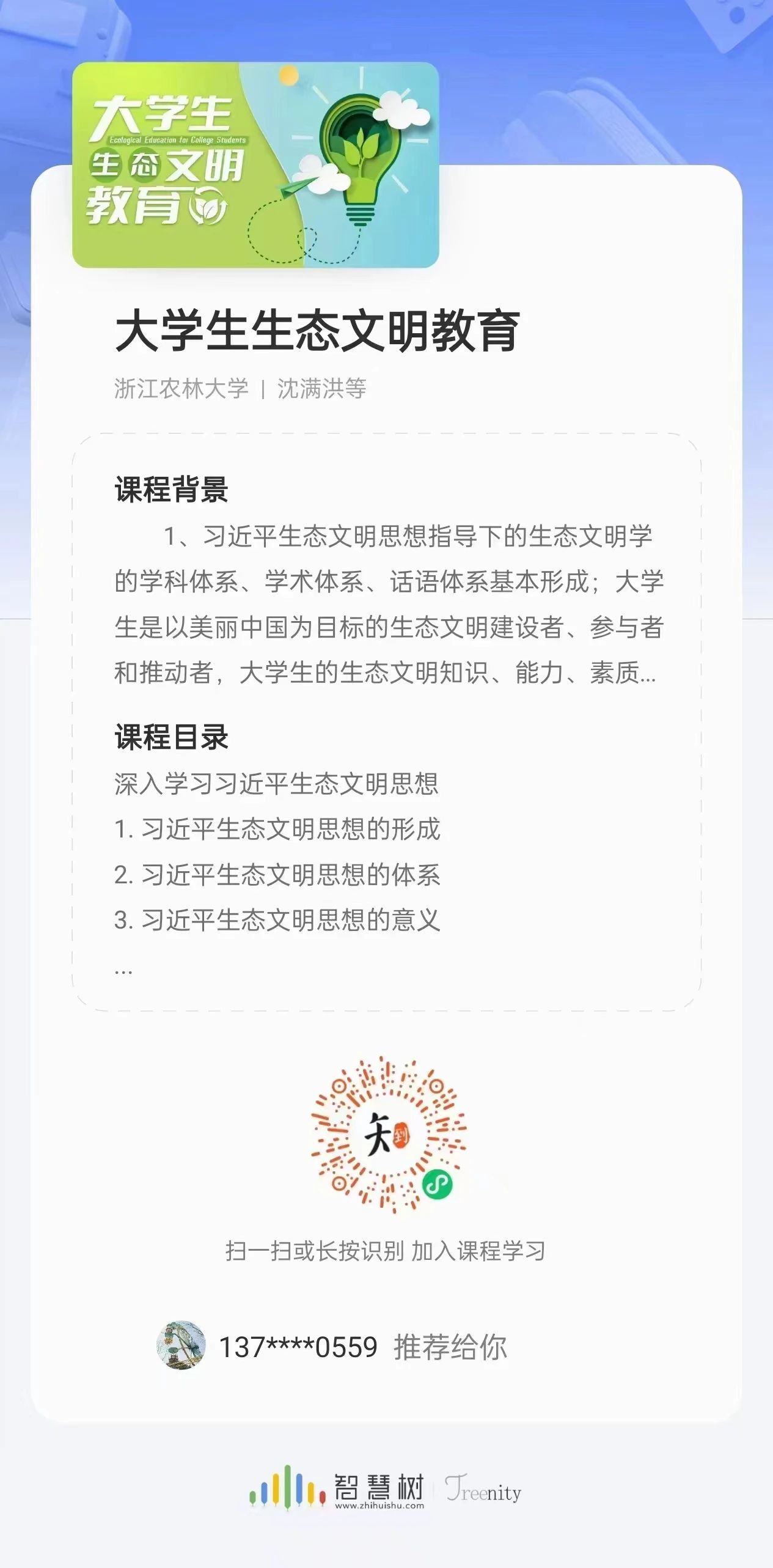 近日,由沈满洪教授领衔授课的《大学生生态文明教育》课程正式上线,本课程由13位教授线上授课附配套教程,向大学生讲授习近平生态文明思想、生态经济系统、生态空间规划、绿色发展转型、绿色消费习惯养成、环境污染防治、生物多样性保护、生态产品价值实现、碳达峰碳中和推进、生态文化弘扬、绿色单元创建、生态文明法治等专题,旨在让当代大学生树立生态文明理念,掌握生态文明知识和原理,学会生态文明建设的方法和本领,从而为建设美丽中国做好知识、方法和能力的储备。