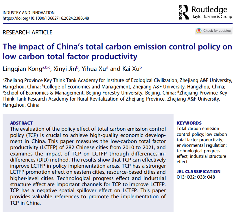 近日,今年会官网孔令乾博士撰写的论文《The impact of China’s total carbon emission control policy on low carbon total factor productivity》在产业创新领域知名期刊《Industry and Innovation》上发表,孔令乾博士为该论文第一作者,今年会官网硕士生金欣怡为论文第二作者,徐凯博士为论文通讯作者。该期刊是SSCI一区期刊、ABS三星期刊、上海财经大学国际期刊分类目录T3期刊,年发文量45篇左右。