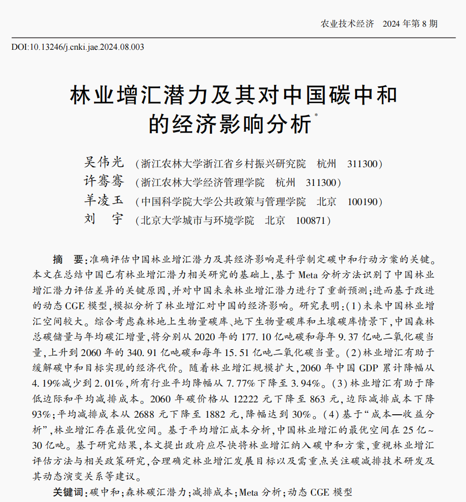 近日,吴伟光教授团队合作学术论文《林业增汇潜力及其对中国碳中和的经济影响分析》在《农业技术经济》2024年第8期发表。
