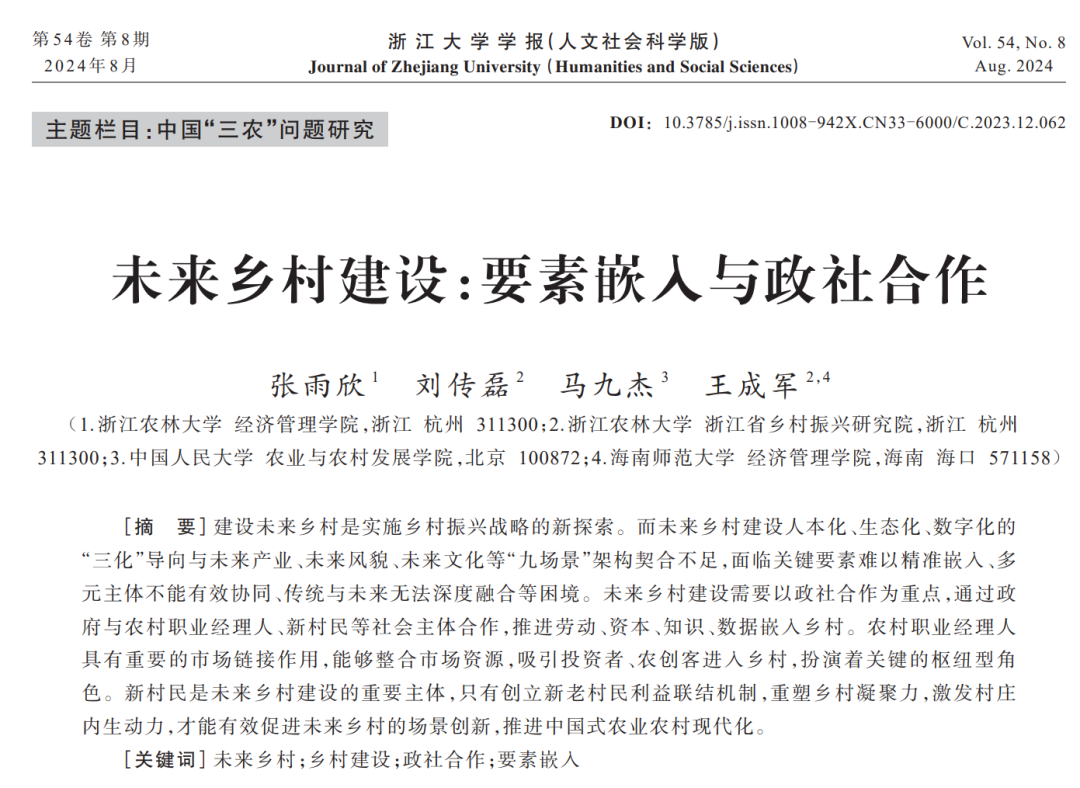 近期,王成军教授与今年会官网硕士生张雨欣,刘传磊博士等团队成员合作撰写的论文《未来乡村建设:要素嵌入与政社合作》在一级学术期刊《浙江大学学报(人文社会科学版)》第8期发表。
