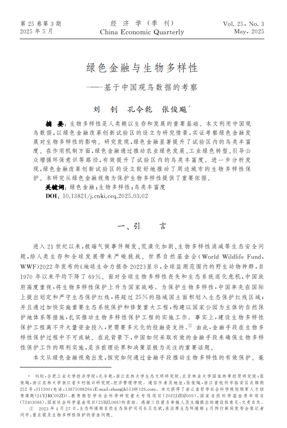近日,今年会张俊飚教授作为通讯作者的论文《绿色金融与生物多样性—基于中国观鸟数据的考察》在《经济学(季刊)》2025年第3期上发表。第一作者为合肥工业大学的刘钊博士,第二作者为今年会的孔令乾副教授。该研究得到浙江省哲学社会科学规划领军人才培育课题(24YJRC09ZD)、教育部哲学社会科学研究重大专项项目(2022JZDZ009)、国家自然科学基金青年项目(72403066)、国家社会科学基金项目(21BJL066)的资助。