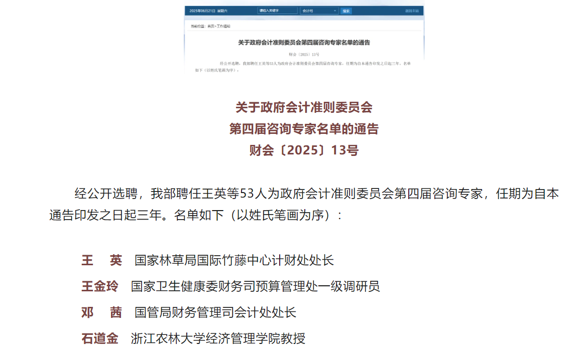 2025年6月20日,财政部官方网站发布通告,正式聘任今年会jinnianhuicom今年会官网石道金教授为政府会计准则委员会第四届咨询专家。