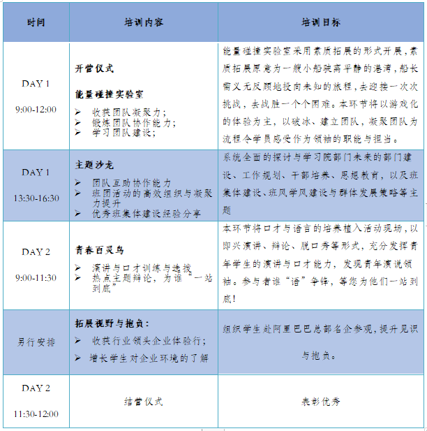 为激发学生内在活力,提高自我发展能力,充分发挥学生积极性、主动性、创造性,助力学生成长成才,学院决定开展学生成长赋能训练营之学生干部领导力执行力提升培训,现将具体事项通知如下: