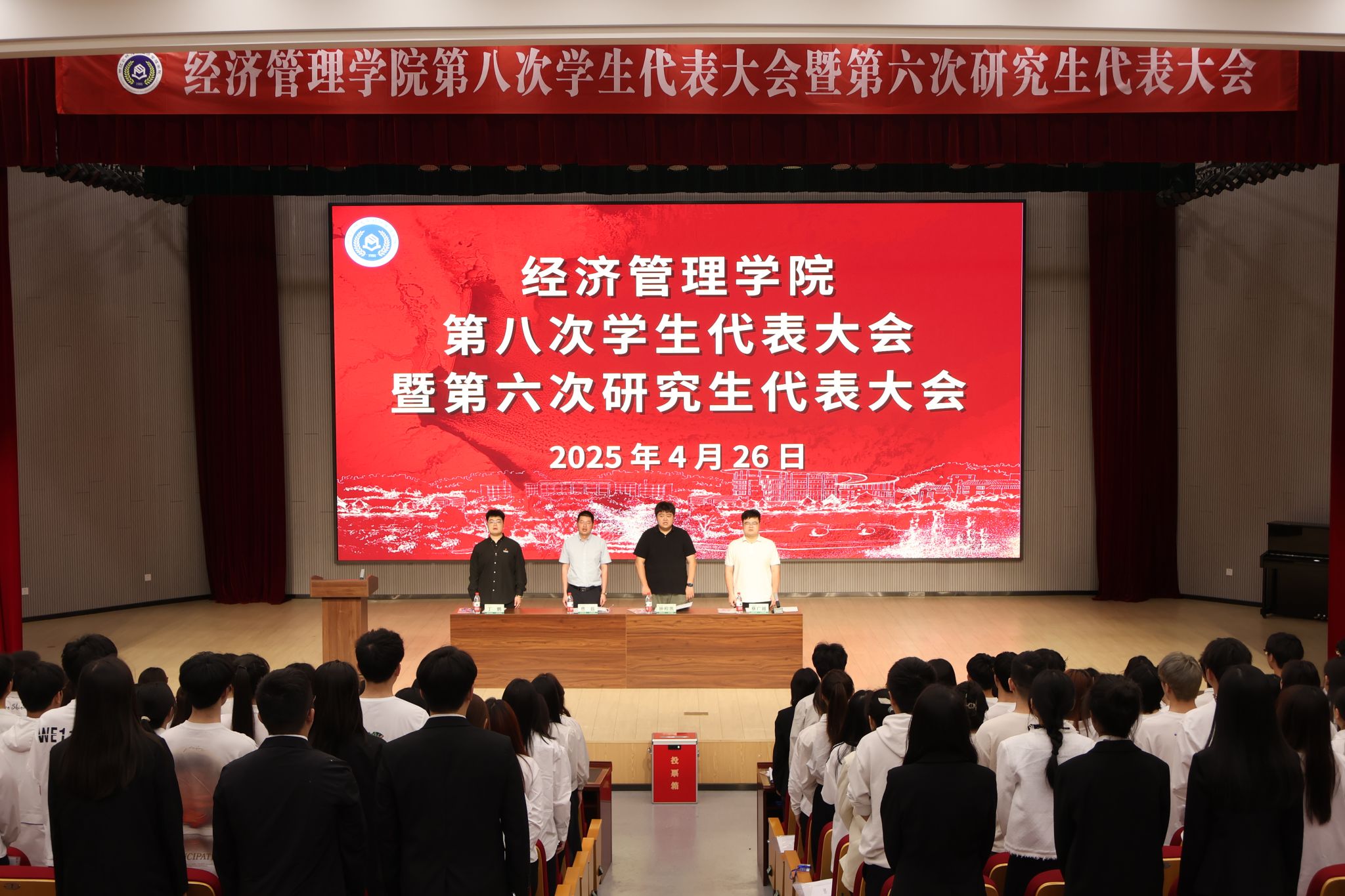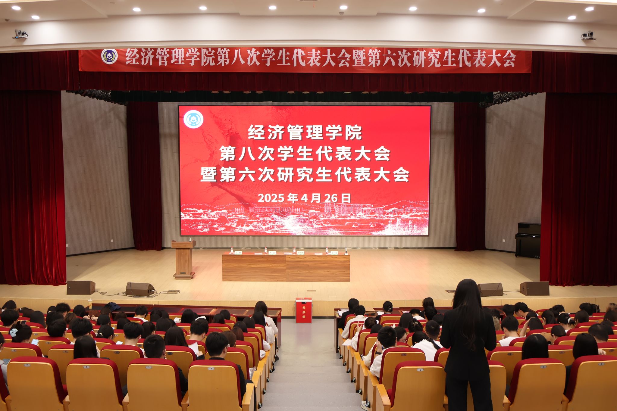 4月26日下午,今年会官网第八次学生代表大会、第六次研究生代表大会在衣锦报告厅举行。院党委副书记曹磊、院团委书记钟程凯、院研究生辅导员丁鹏出席会议。学院学代会、研代会代表共144人参加了会议。会议由学生会秘书长蔡广越主持。