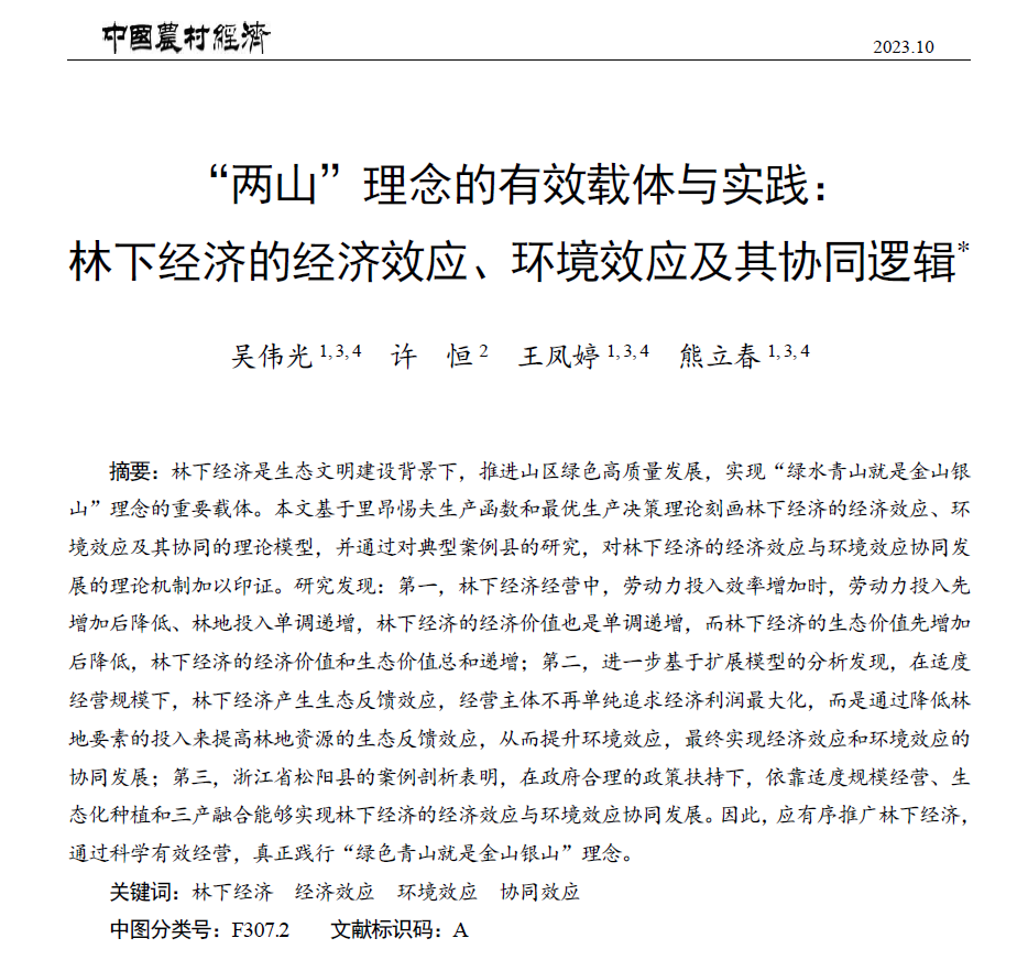今年会吴伟光教授团队研究成果在《中国农村经济》发表 近日,学院吴伟光教授团队的研究论文《“两山”理念的有效载体与实践:林下经济的经济效应、环境效应及其协同逻辑》在知名期刊《中国农村经济》2023年第10期发表。该文通过经济学模型推理和典型案例分析得出如下观点:证明了林下经济经营活动在创造经济价值的同时同样会创造生态价值,当林下经济所形成的生态价值有利于当地生态环境提升时,经营主体经营的林下经济及其周边生态环境的经济价值也会显现,即产生正向的生态反馈效...
