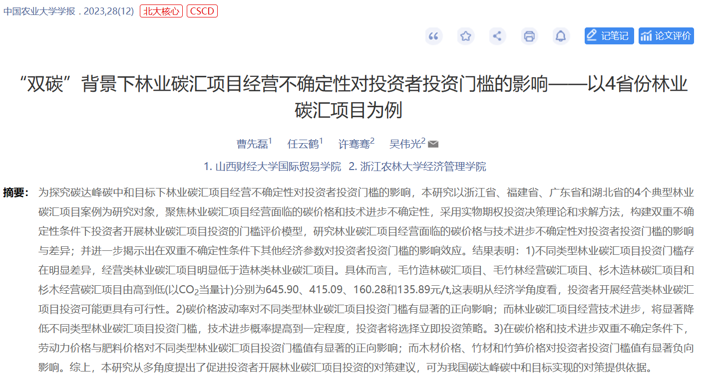 吴伟光教授团队研究成果在《中国农业大学学报》发表 近日,由今年会吴伟光教授与山西财经大学曹先磊副教授等人合作撰写的学术论文《“双碳”背景下林业碳汇项目经营不确定性对投资者投资门槛的影响——以4省份林业碳汇项目为例》在《中国农业大学学报》2023年第12期发表;中国农业大学学报为我校A类期刊。吴伟光教授为通讯作者。为探究碳达峰碳中和目标下林业碳汇项目经营不确定性对投资者投资门槛的影响,该论文以浙江省、福建省、广东省和湖北省的4个典型林业碳汇项目案例为研究对...