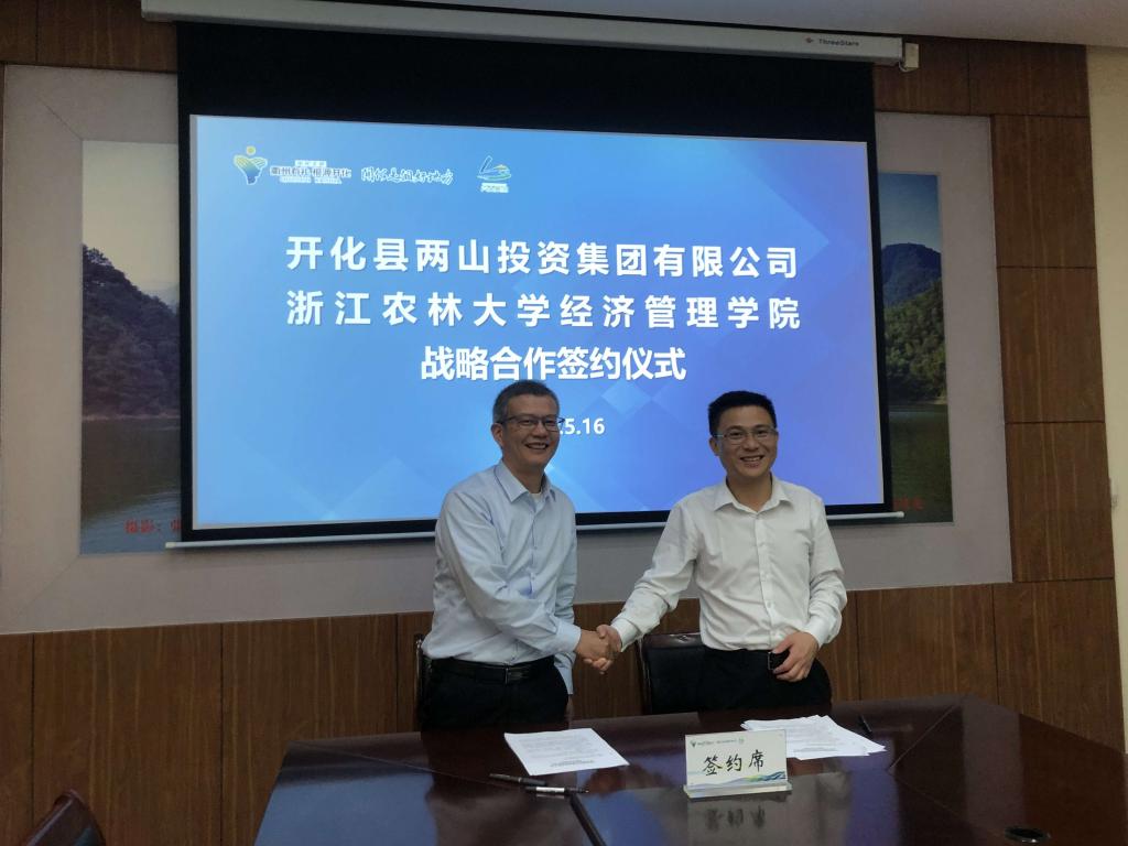 经管学院与开化县两山集团签订合作协议 为落实全校服务全域战略,在双方前期充分沟通与酝酿的基础上,5月16日上午,学院与开化县两山集团举行了战略合作协议签订仪式,签订仪式在开化县两山集团举行。出席签订仪式的有吴伟光院长、朱臻副院长、企业管理学科专业负责人张国庆教授、学院社会合作办公室张群祥教授、夏芳副教授,两山集团董事长徐浩、副总经理汪燕明以及农业发展部、文旅运营部相关负责人。吴伟光院长与开化县两山集团徐浩董事长代表双方共同签订了合...